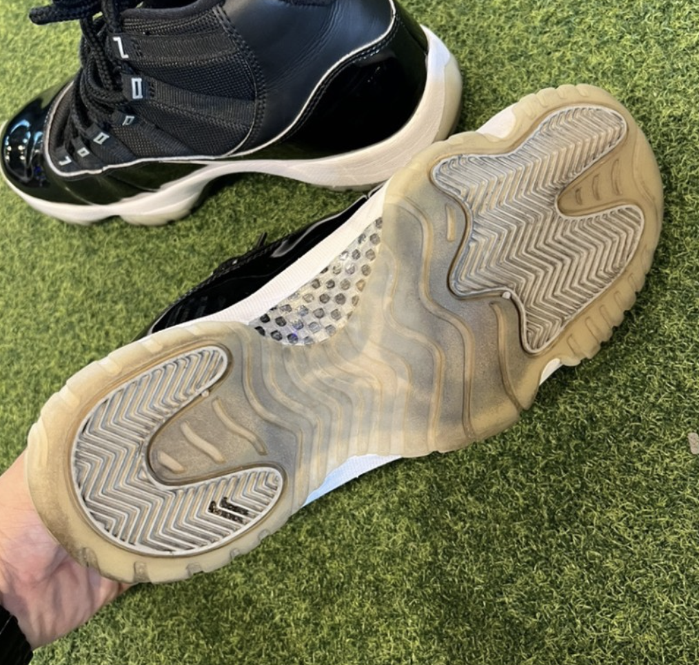 조던 11의 아웃솔에는 카본 처리가 돼있고, 그 위에 반투명 고무 아웃솔과 앞축, 뒷축에 또 하나의 고무 굽 처리가 돼있어서 논슬립에 상당히 신경을 썼다는 걸 알 수 있습니다.